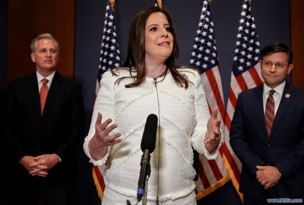 2021年5月14日,美国纽约州共和党籍联邦众议员爱丽丝·斯蒂芬尼克在华盛顿国会山向记者讲话。新华社/路透