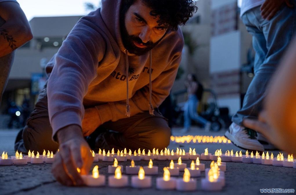 2024年10月7日,新一轮巴以冲突爆发一周年之际,在美国加利福尼亚州洛杉矶,加利福尼亚大学洛杉矶分校的学生们参加集会活动时点亮蜡烛。新华社/美联
