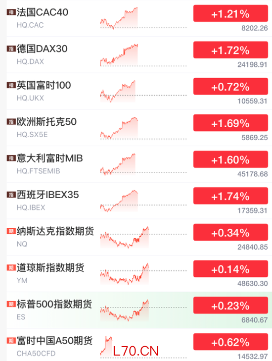 目前,欧洲股市集体上涨约1%,美股盘前也在反弹,富时中国A50期货指数涨约6%。