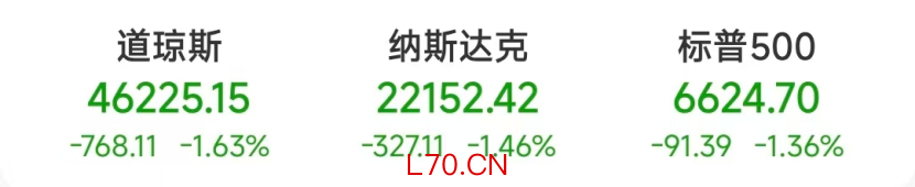 截至当天收盘,道指跌768.11点,跌幅为1.63%,报46225.15点;纳指跌327.11点,跌幅为1.46%,报22152.42点;标普500指数跌91.39点,跌幅为1.36%,报6624.70点。